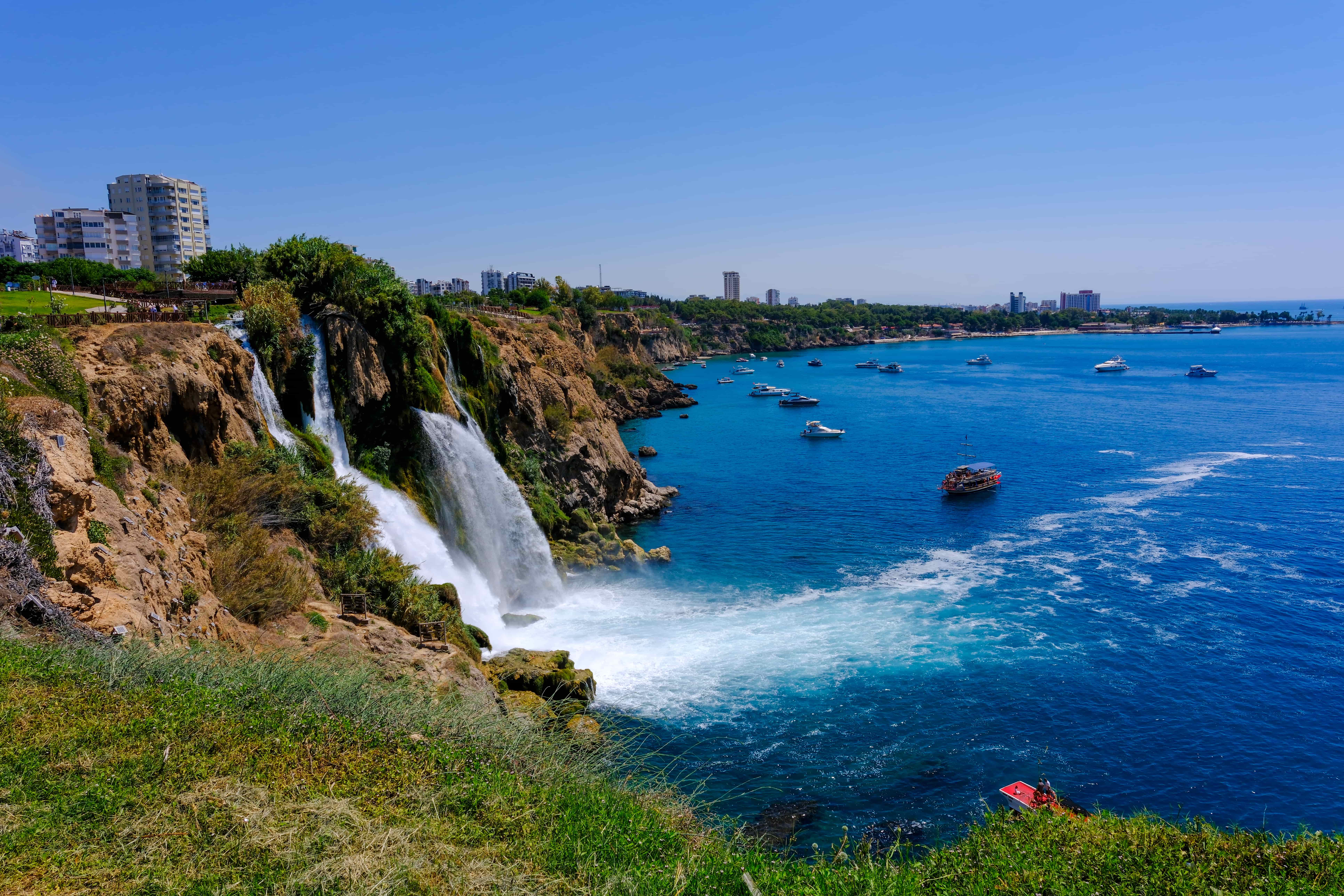 Дюденский водопад Анталия — сюда легко заехать даже между пляжем и прогулкой по городу. Он расположен прямо в городской черте. Верхний Дюден окружен зеленым парком, прогулочными дорожками и смотровыми площадками. Нижний Дюден впечатляет тем, что поток воды обрывается прямо в Средиземное море — зрелище действительно завораживающее.